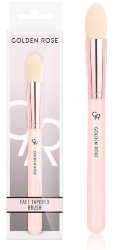 Face Tapered Brush marki Golden Rose. Pędzel do makijażu. Posiada włosie przycięte na kształt stożka przez co idealnie poradzi sobie podczas aplikacji sypkich kosmetyków, takich jak róż, bronzer czy rozświetlacz. Wykonany jest z syntetycznego, miękkiego włosia, które ułatwia kontrolę nad ilością aplikowanego produktu na skórę. Drewniana rączka została polakierowana na odcień brzoskwiniowego różu, który pięknie się komponuje z miedzianą skuwką.