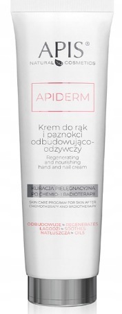 Apis APIDERM Odbudowująco-odżywczy krem do rąk i paznokci to preparat rekomendowany dla skóry każdego typu, ze szczególnym wskazaniem skóry po chemio- i radioterapii. Produkt intensywnie nawilża, regeneruje oraz odbudowuje płaszcz hydrolipidowy. Zawartość naturalnych olejów - słonecznikowego, lnianego, skwalanów pozyskiwanych z oliwy z oliwek oraz masła Shea odżywia skórę i ochrania przed działaniem niekorzystnych czynników środowiskowych.